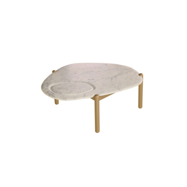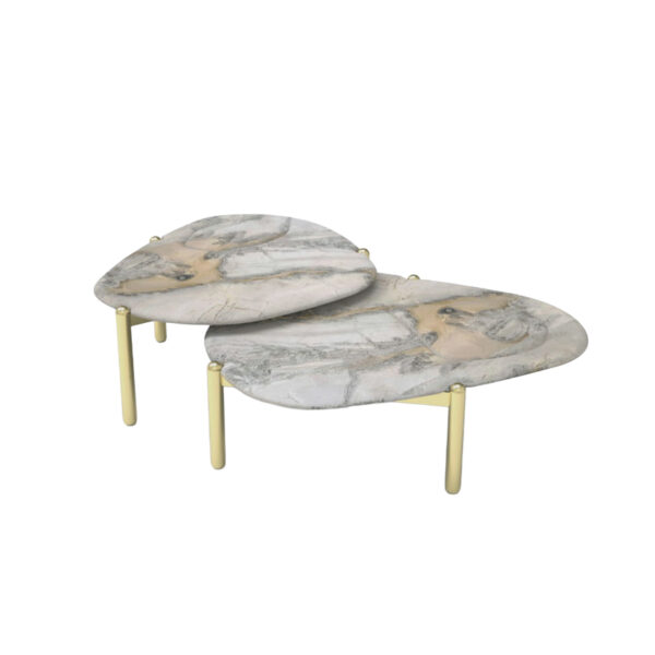 Os desenhos das peças em mármore, me remete bastante essa questão do raio e do trovão, então com certeza o mármore é o elemento principal dessas mesas de centro e lateral.